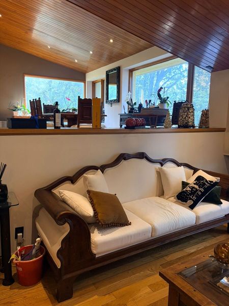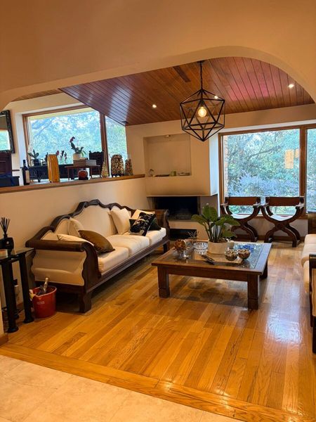 Entrando a la casa encontraras, medio baño de visitas y sala con vista arbolada.