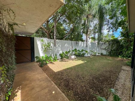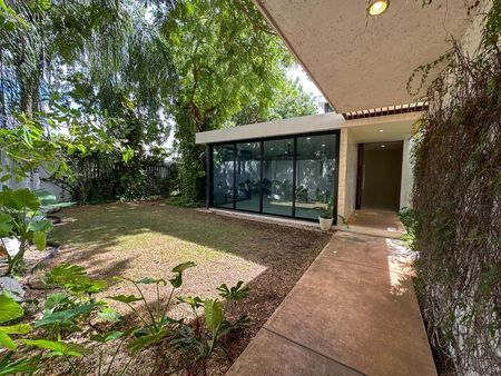 El exterior es uno de los grandes atractivos: una piscina rodeada de vegetación, un jardín amplio con árboles maduros y áreas de convivencia que te dan la sensación de estar en un pequeño oasis dentro de la ciudad.