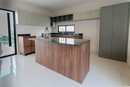 Cocina con isla forrada con granito, incluye gavetas inferiores.