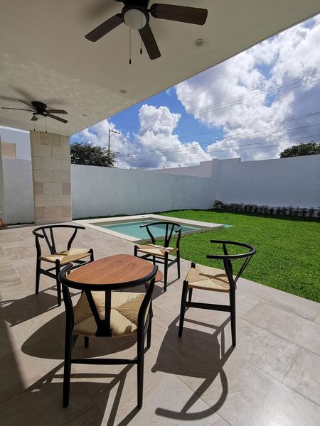 Casa en venta 229.09 m2 de construcción en una superficie de 363 m2. Cuenta con 3 recámaras, 3.5 baños, piscina con terraza cochera para 2 vehículos, cuarto de servicio ubicada en Cholul dentro de privada residencial al norte de la ciudad de Mérida, creada para vivir en un ambiente familiar rodeado de naturaleza y espacios funcionales.