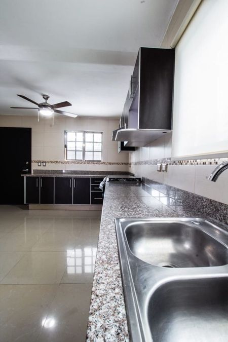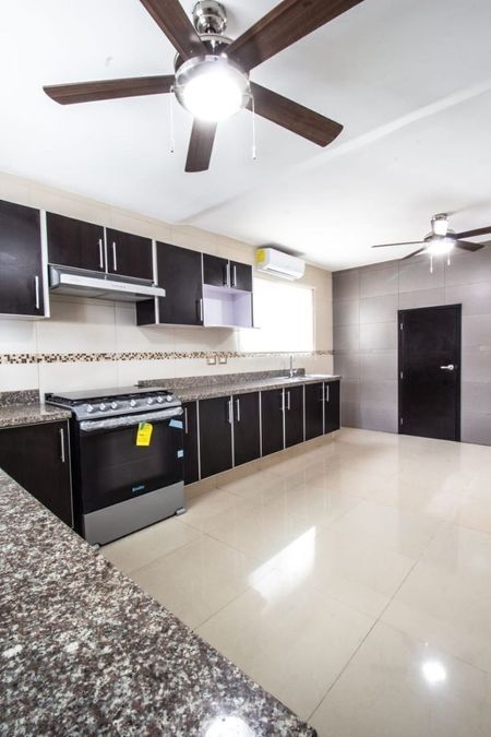 - Cocina con gavetas inferiores y superiores, estufa nueva y campana de acero inoxidable marca Mabe y barra de granito, ventilador y aire acondicionado