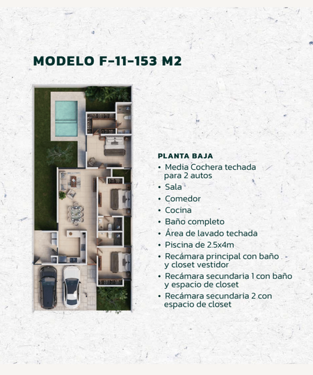 Caseta de vigilancia, petpark, circuito de joggin, piscina tipo resort, área de juegos infantiles, área de picnic, áreas verdes, cancha multiusos, 2 canchas de pádel, área de asadores en alberca, cancha de futbol,casa club.