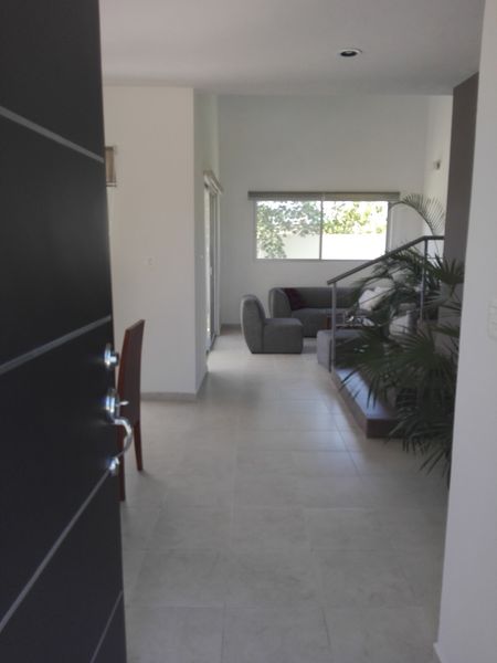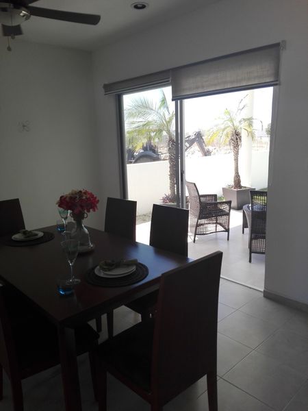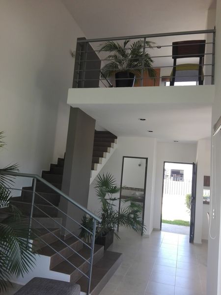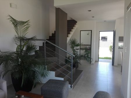 Cochera para dos autos, Sala a doble altura, comedor y cocina en concepto abierto, baño de visitas, pasillo de servicio, jardin posterior, baño de visitas