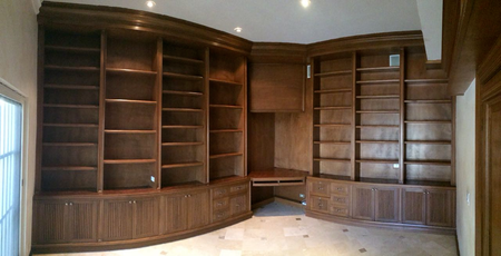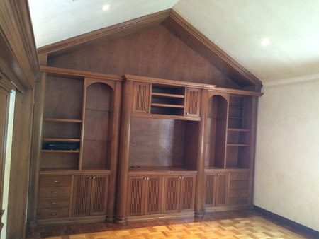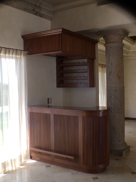 Doble Sala con bar y chimenea enmarcada con muebles de madera empotrados.