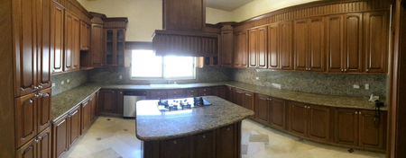 Amplia Cocina Integral con granito en cubiertas, backsplash e isla; despensa, estufa y campana con extractor.