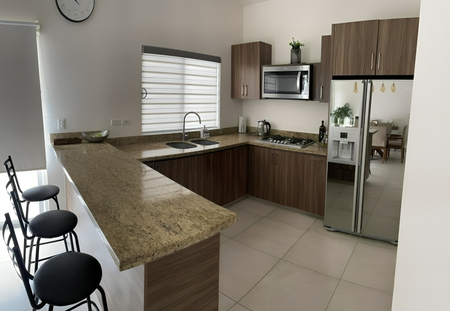 - Cocina integral con cubierta de granito, equipada con estufa, campana y refrigerador