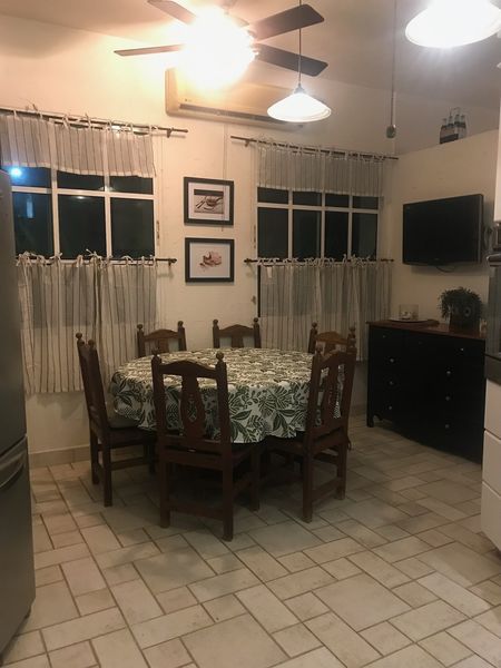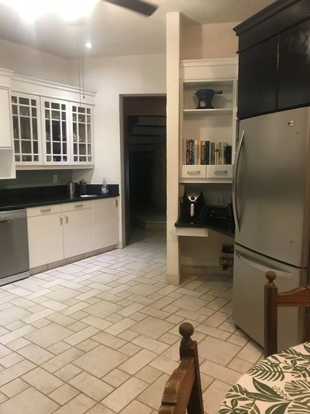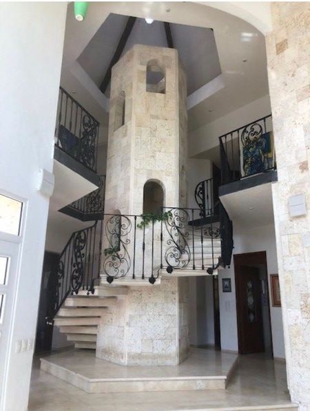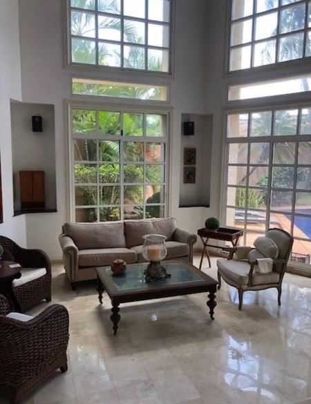 Casa estilo californiano, con acabados de mármol, piedra de conchuela, cancelería de aluminio antihuracán, planta de luz pequeña. Cuenta con aires acondicionados y ventiladores de techo.