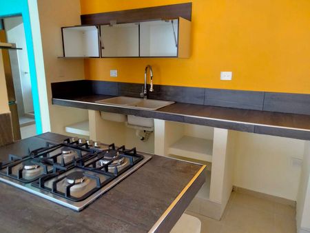 -Cocina vestida con gavetas inferiores y superiores, acceso al pasillo lateral