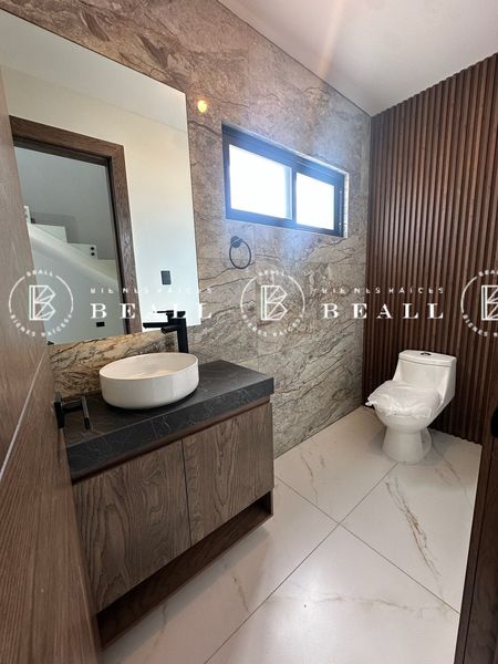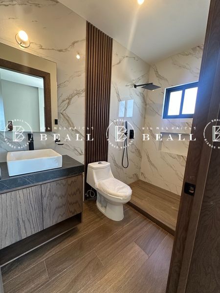 Acabados de lujo · Construida con block térmico · Losa aislada con placa de 1" · Carpintería de encino · Ventanería de aluminio doble vidrio · Cocina con granito, estufa, campana, tarja · Cisterna 2800 lts · Hidroneumático · Boiler · Gas natural · 2 aparatos de aire Mastercool · Preparación para minisplit en recámara principal · Impermeabilización con papel mineralizado.