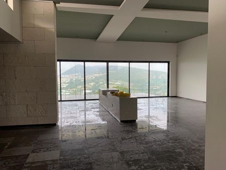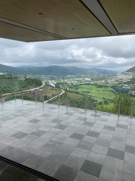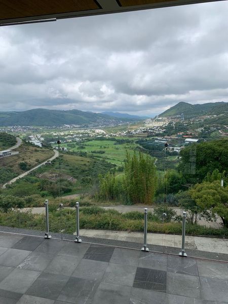 Terraza volada con vista al campo de golf con barandal de cristales templados .
