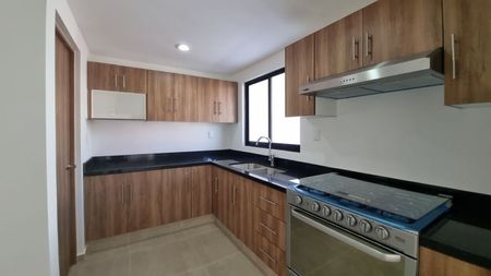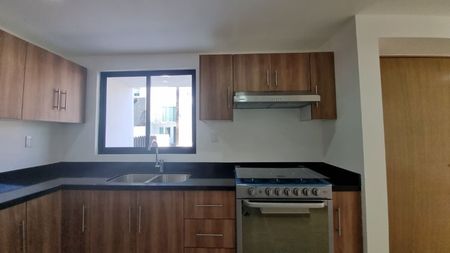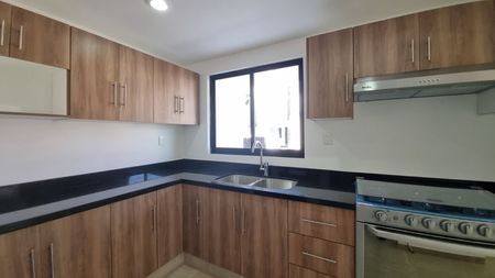 * Cocina cerrada con granito, doble tarja, cajones para cacerolas, despensa, espacio para refrigerador grande con toma de agua.