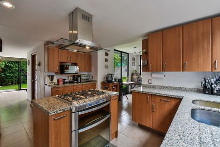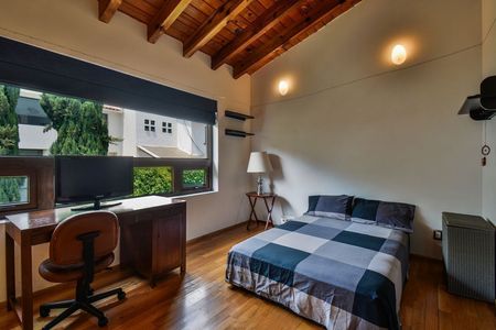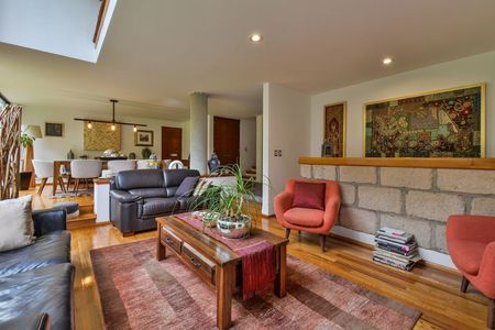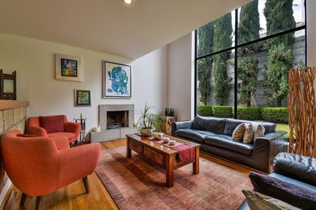 La casa te ofrece dobles alturas, techos altos, espacios muy luminosos y espaciosos. En planta baja cuenta con vestíbulo, sala con chimenea y bar con vista al jardín, comedor con salida al jardín, estudio, medio baño, cocina y antecomedor. En planta alta, recámara principal con vestidor y baño, 2a recámara con vestidor y baño, 3a recámara con closet y baño y estudio independiente o 4a recámara sin baño. Tiene 3 estacionamientos techados para autos grandes.
