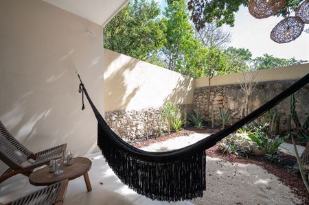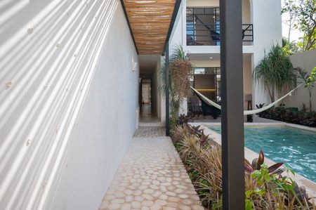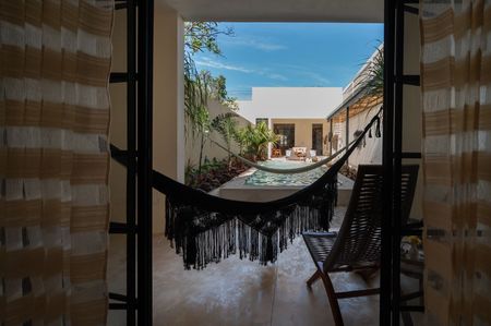 La fachada de la casa tiene un acabado de mampostería típico de la arquitectura yucateca. Los bordes de la base, puerta y ventanas están hechos de chukum y la carpintería de Tzalam es nueva.
