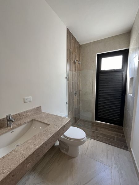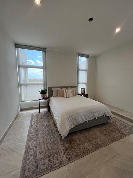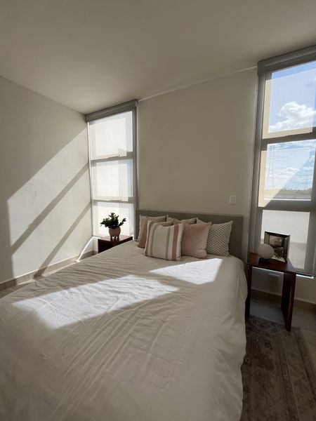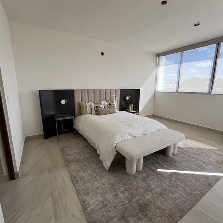 Recámara principal con baño con doble lavabo, closet vestidor y balcón
