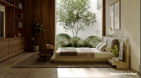 La recámara principal es un auténtico santuario personal. Cuenta con un amplio vestidor y un baño tipo spa, donde la regadera se abre hacia un jardín privado, creando una experiencia íntima de bienestar.