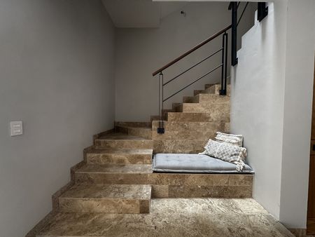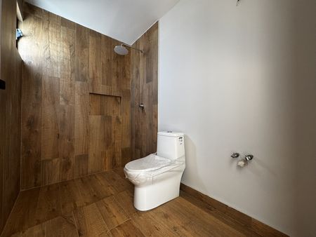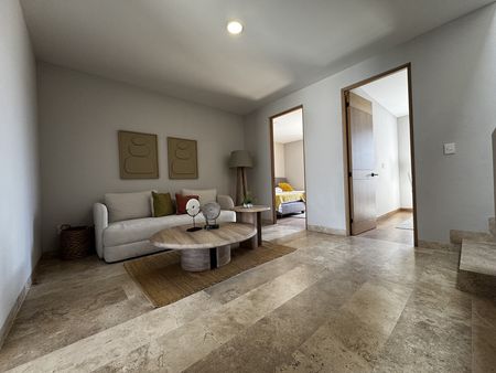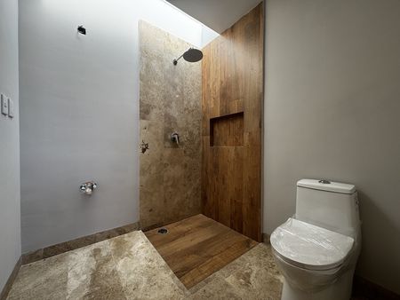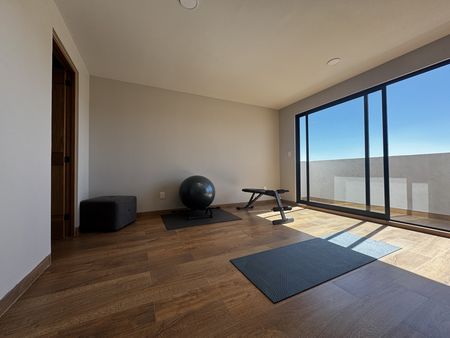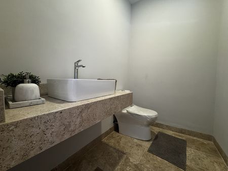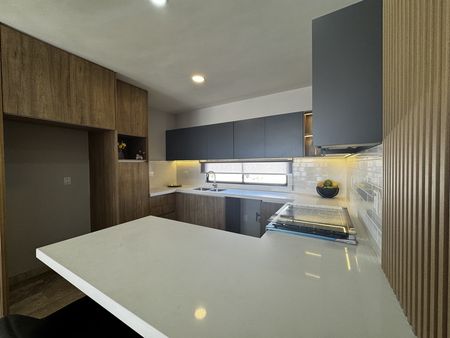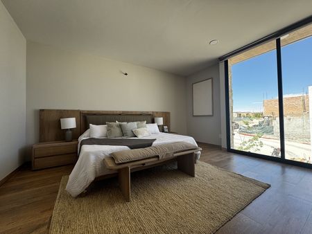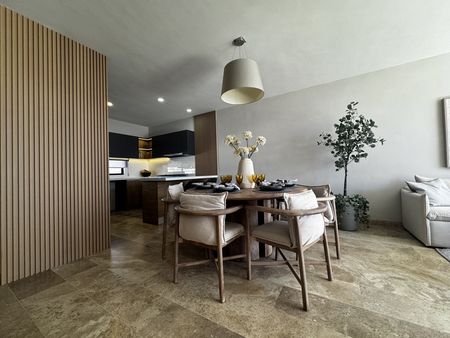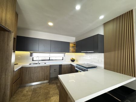 Planta baja: Sala comedor, cocina integral en concepto abierto con barra desayunador, flex Room, 1 baño completo, área para jardín, cochera semitechada para 2 autos, bodega en cochera.
