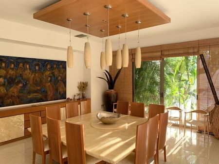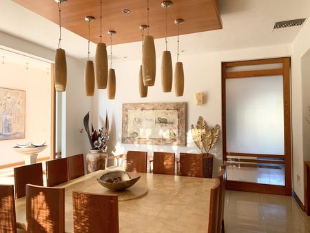 • Amplia área de comedor con mesa de Ónix para 12 personas, y plafón de madera a juego con lámpara de Ónix.