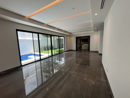 Recibidor, sala-comedor, cocina, estudio con baño completo, cuarto de servicio, aplio patio con terraza con alberca y baño completo y cochera para tres carros.