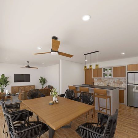 • Carpintería en cocina con barra de granito Santo • Tomas, parrilla de gas y lámpara decorativa.