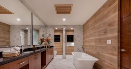 *La recámara principal destaca por su elegante tina y vistas hacia el jardín.