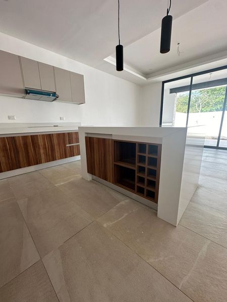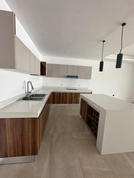 Cocina con mesetas de Quarzo blanco, carpintería bajo cubierta, espacio para vinos y gavetas.