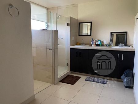 Cuenta con sala comedor a doble altura , cocina con alacena, medio baño de visitas, la recamara principal con baño , otra recamara grande con baño completo, dos recamaras que comparten baño completo, ademas una recamara muy grande con baño completo y calentador eléctrico independiente, cuenta con una terraza y que da al acceso para bajar al jardín privado con alberca privada, palapa privada equipada con cocina, mesas para la convivencia familiar. Cuarto de servicio con baño completo, bodega y equipo de asador, calentadores solares para la alberca privada caldera de gas y medio baño para los invitados.
