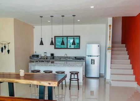 Cocina open plan equipada con estufa, refrigerador, cafetera, micro ondas y utensilios con barra desayunador, comedor y sala.