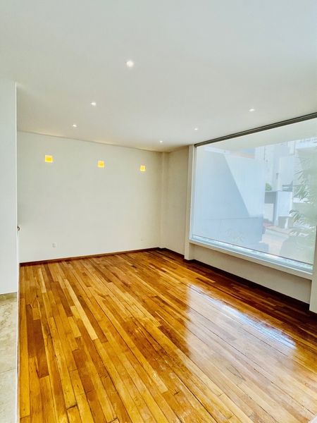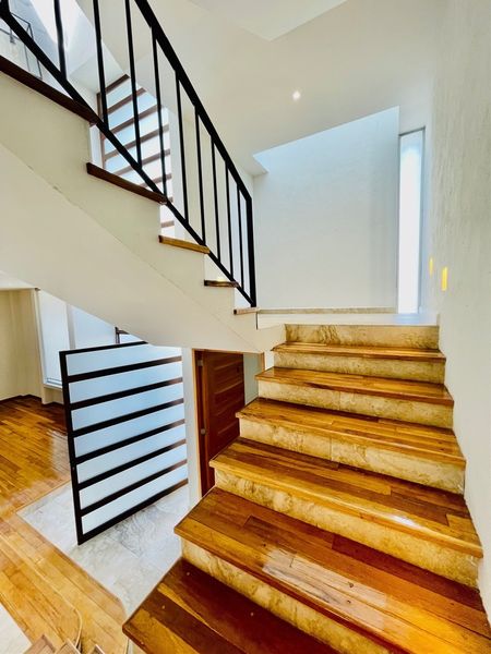 El piso de sala, recamara principal y escaleras en madera de caoba.