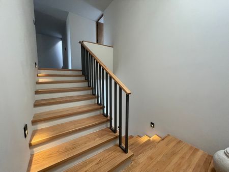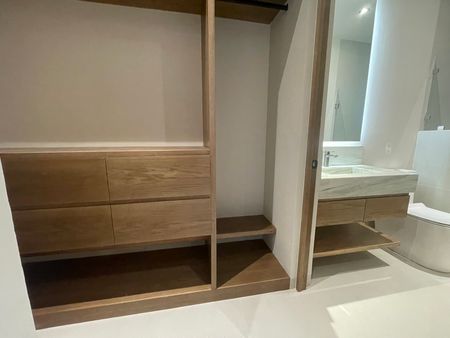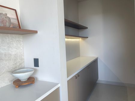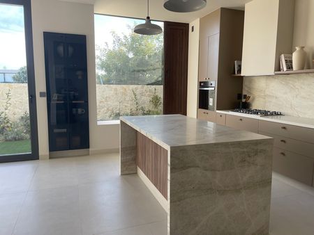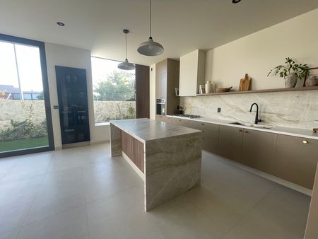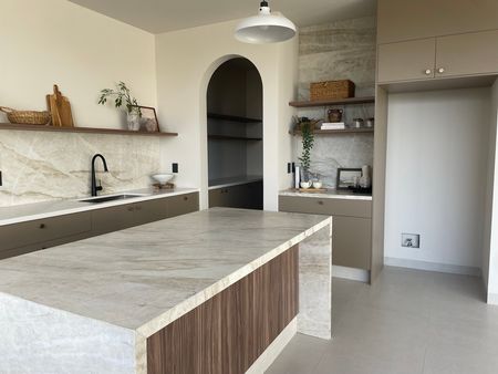 Cocina es de Modul con cubiertas de cuarzo y cuarcita (isla y backsplash)