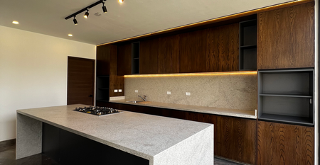 o Granito Blanco Sienna en acabado Leather para isla de cocina y backsplash