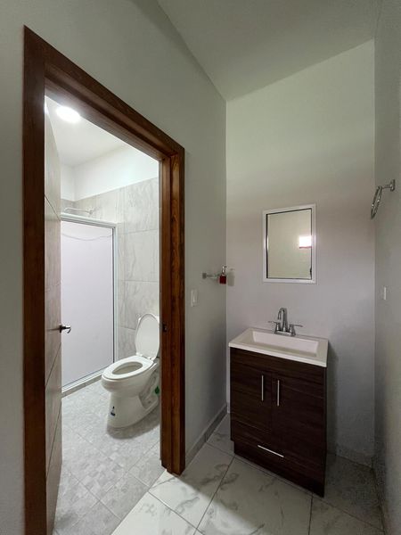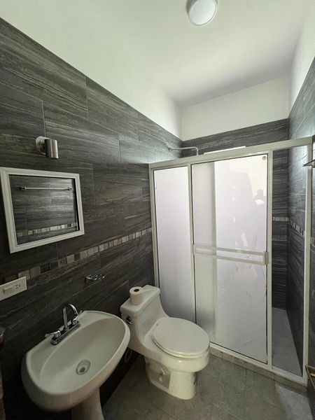 Habitación principal con vestidor y baño privado con cancel y accesorios, con mueble en lavamanos.