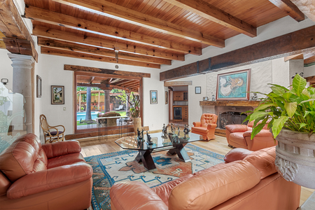 Nos da la bienvenida una puerta principal labrada de madera y cristales biselados que son toda una obra de arte. Cuenta con una muy buena distribución y espacios amplios. Sala con chimenea y comedor, ambos con vista a la terraza