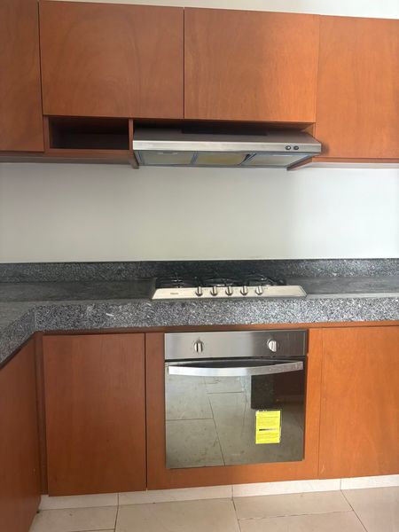 Cocina integral equipada con barra de granito, gavetas superiores e inferiores, refrigerador, horno, parrilla de 6 quemadores, campana y cuarto de alacena.