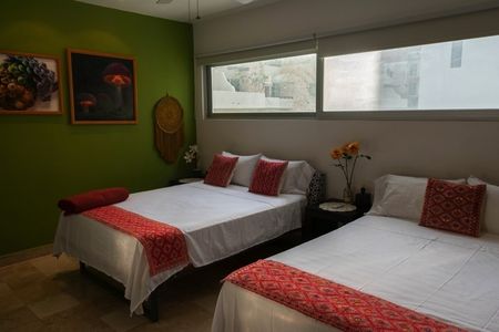 Este moderno departamento cuenta con 2 habitaciones, 2 baños y una sala de estar con techos de doble altura y ventanas de piso a techo que inundan los interiores de luz natural. En la planta baja encontrará una amplia sala familiar, ideal para relajarse o entretener a los huéspedes. La terraza panorámica en el rooftop del edificio es impresionante, con una alberca infinita y mucho espacio para descansar.