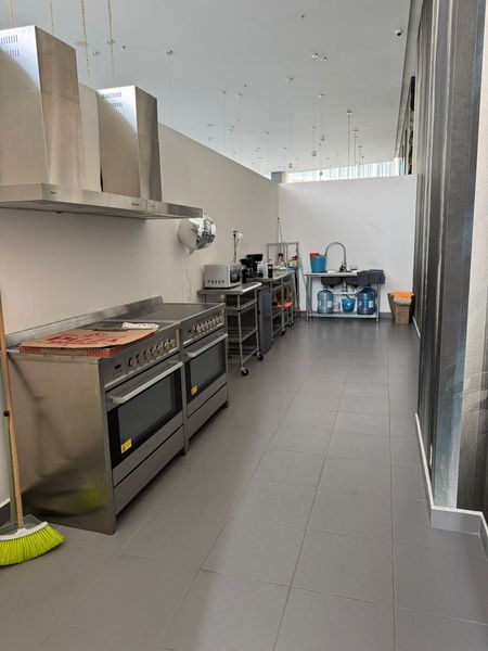 Cocina con parrilla eléctrica, horno y hermosa campana.