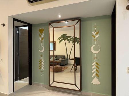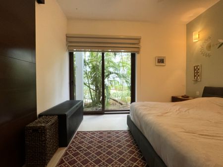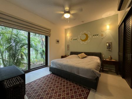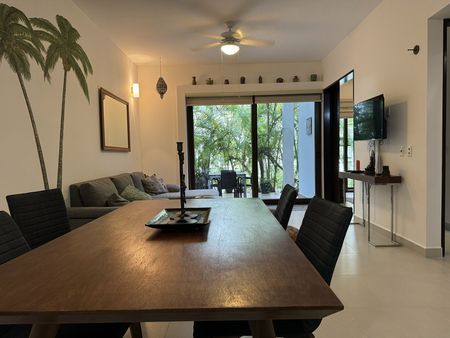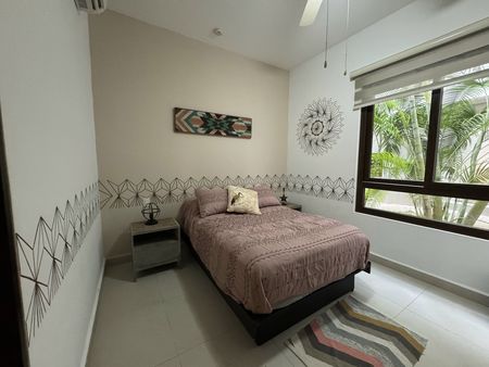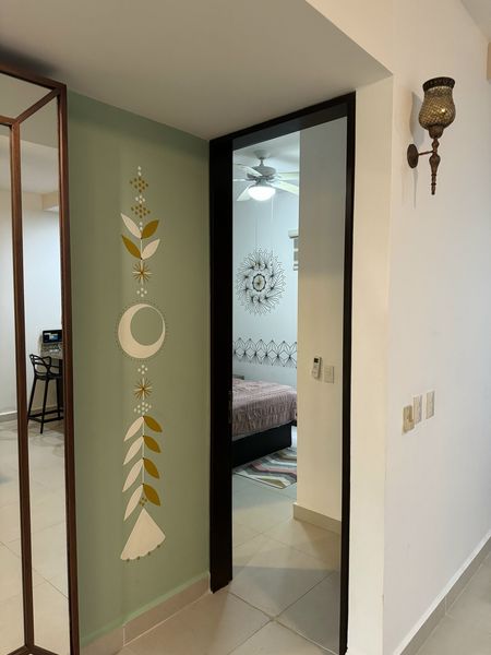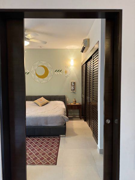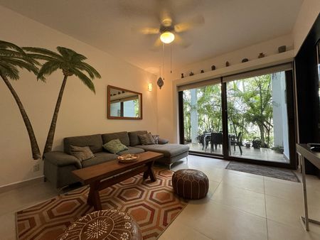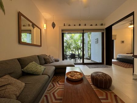 El departamento cuenta con cocina equipada, amueblado y diseñado al estilo boho. Tiene una pequeña terraza en la parte posterior protegida naturalmente con vegetación.