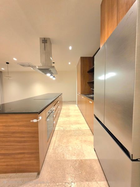 Cocina equipada con barra desayunadora, horno microondas, horno multifuncional, campana y refrigerador french door.
