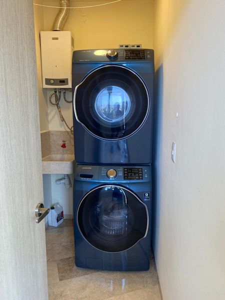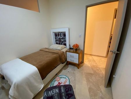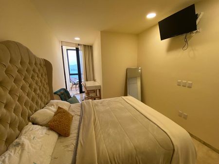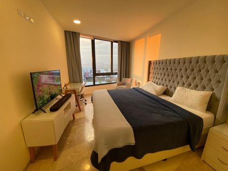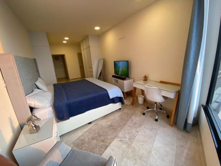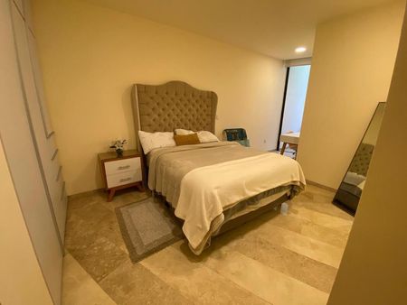 Recámara principal con walk-in closet, baño completo, pantalla y escritorio.