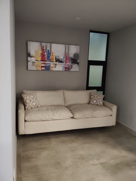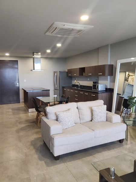 ESTÁ TOTALMENTE AMUEBLADO Y EQUIPADO, MUEBLES EN SALA Y COMEDOR, COCINA VESTIDA CON ELECTRODOMÉSTICOS Y BARRA DESAYUNADORA, RECÁMARA MATRIMONIAL CON BAÑO PROPIO, ESTUDIO.