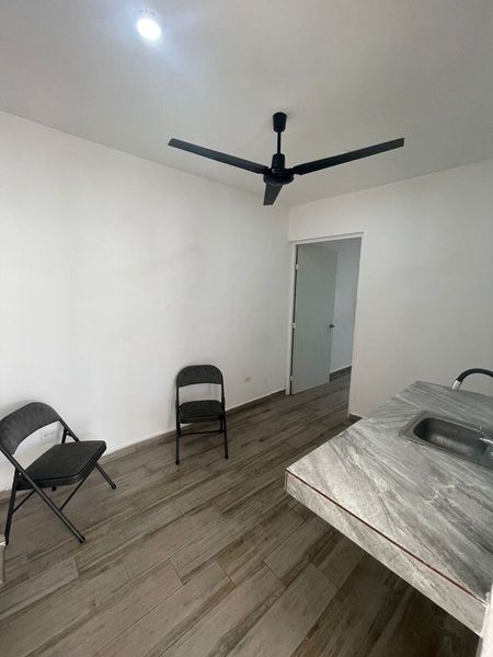• Área de comedor con mesa, sillas, frigobar, meseta con fregadero, repisas y ventilador de techo.