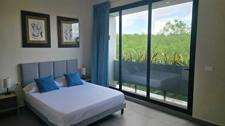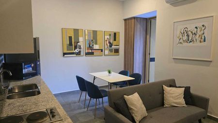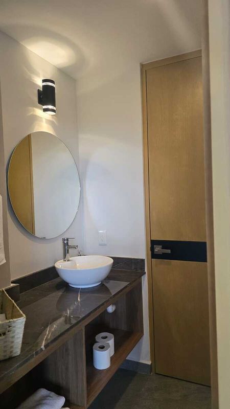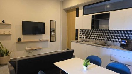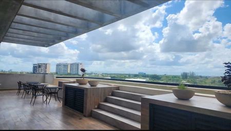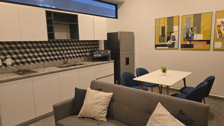 El departamento cuenta con área social, cocina, una recamara vestida, baño completo, balcón y está completamente vestido. Cuenta con una television, lavasecadora cuadros, artículos decorativos, mesas de centro.