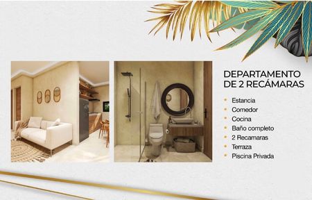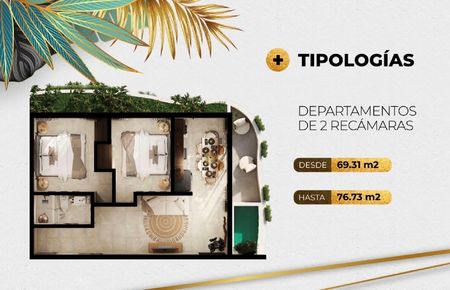 Contamos con tipologías estudio, de 1 y 2 recámaras con baño, desde 38.44m2 hasta 76.73m2, en diferentes formatos, *totalmente equipados, bajo esquemas desde el 50% de enganche se entregan amueblados y decorados, con llave en mano.