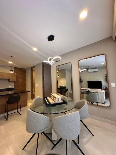 Se entrega con carpintería de madera de encino, en cocina, baños y closets, lámparas decorativas en sala y baños, espejos y cristal templado en baños.