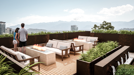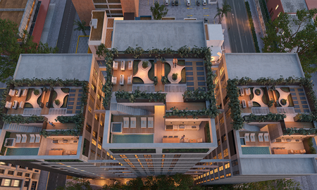 Cuenta con las siguientes amenidades: área comercial, terrace in the sky, pool y jacuzzi en cada torre, bbq area, fire pits, gym, zona de yoga, en garden, juice bar, work space, library area, offe bar.