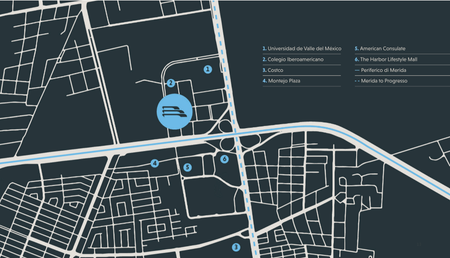 Está ubicado estratégicamente en la carretera a Progreso-Mérida y el anillo periférico , cerca de la Universidad UVM, Colegio Iberoamericano, Costco, Plaza The Harbor, Plaza Galerías, agencias de autos.