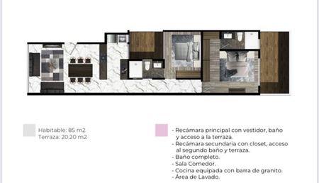 El departamento cuenta con 85m2 de interiores + terraza de 20.60m2, haciendo un total de 104.76m2, distribuídos en 2 recámaras, la principal con baño y vestidor y acceso a la terraza, recamara secundaria con closet, acceso a 2o. baño y terraza, baño completo, sala comedor cómoda, cocina equipada con barra de granito y área de lavado.