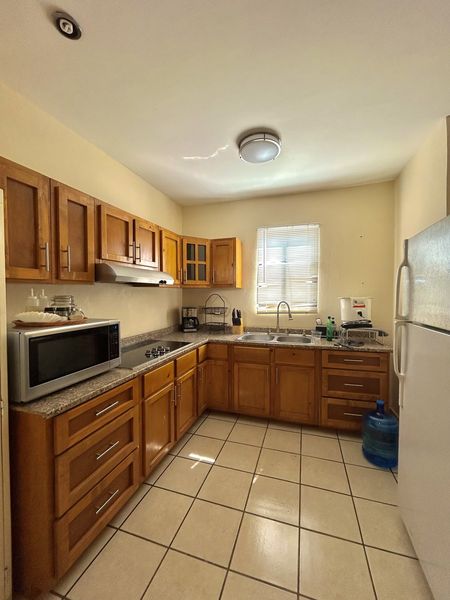 - Cocina equipada con estufa eléctrica -no de inducción-, refrigerador, microondas y campana.