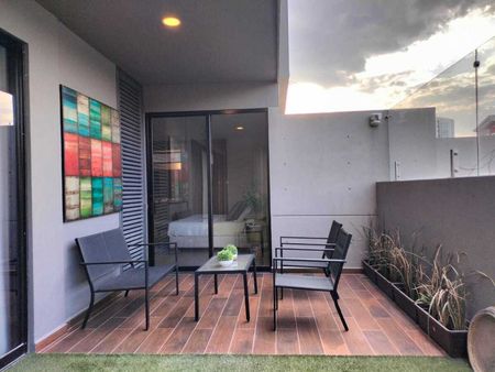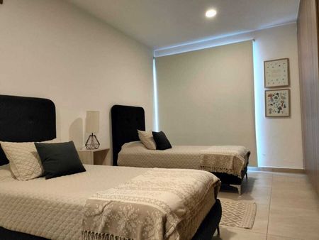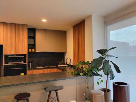 Departamento con recámara principal con vestidor y baño, recámara secundaria con closet y baño, medio baño de visitas, sala, comedor, cocina integral con barra, terraza y dos cajones de estacionamiento.