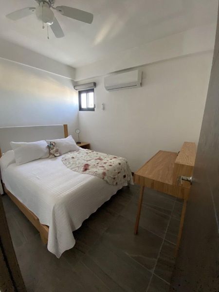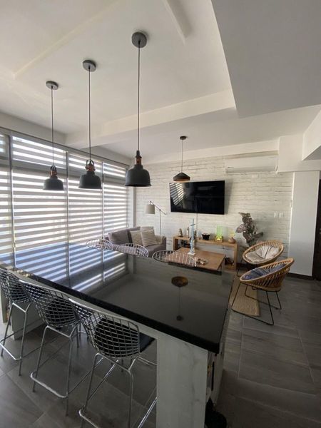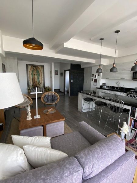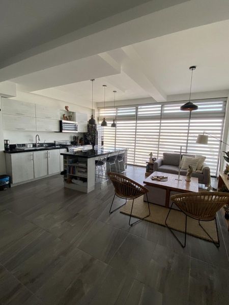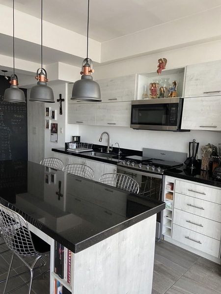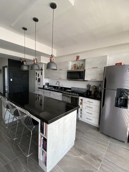 Cocina integral equipada (Refrigerador, estufa, microondas, campana, tarja, grifos, granito)