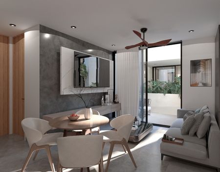 1 rec 1 baño, barra de concina, sala comedor corrido closet, terraza, balcon, jardin interior , parrilla electrica y gavetas interiores, canceles fijos y area de lavado, Entega junio 2027.